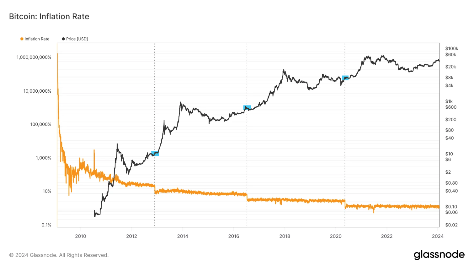 Cours du Bitcoin depuis 2010, avec ses 3 halvings en bleu