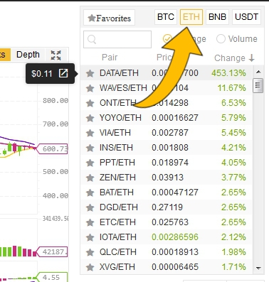 Pour toutes les autres paires, rendez-vous sur la page de trade. Puis, à droite de celle-ci, cliquez sur l'onglet ETH, et choisissez la paire avec laquelle vous souhaitez acheter.