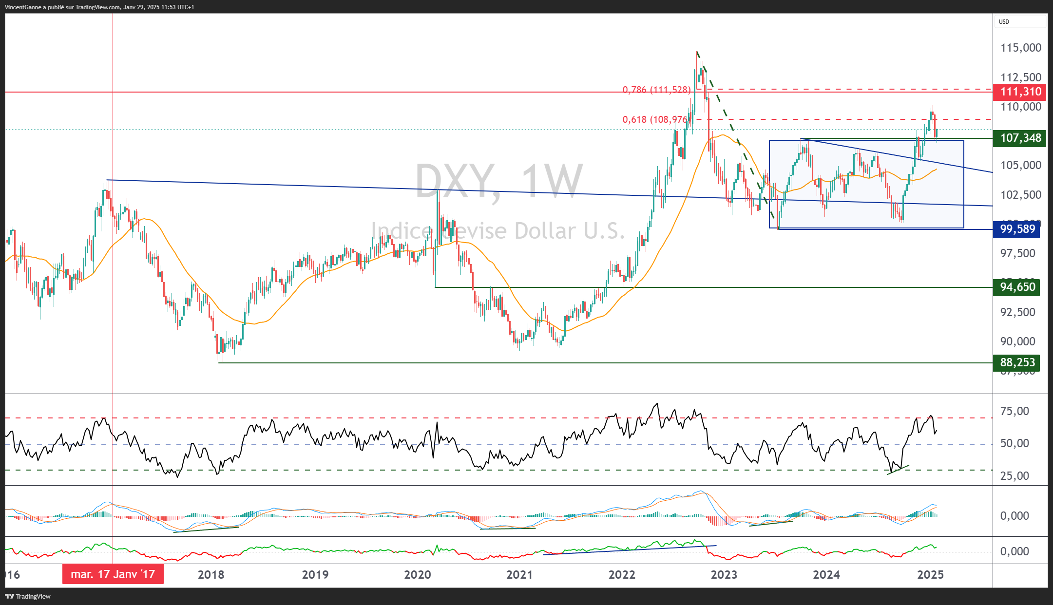 Graphique qui expose les bougies hebdomadaires du dollar américain face à un panier de devises majeures