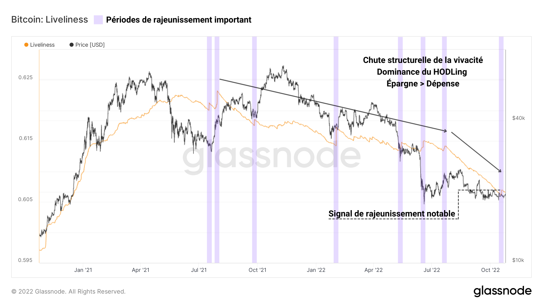 En observant la vivacité des UTXO, il est possible de jauger à quel point un pic de destruction de Jours de Pièces (JP) impacte le comportement général d'épargne/dépense du réseau.