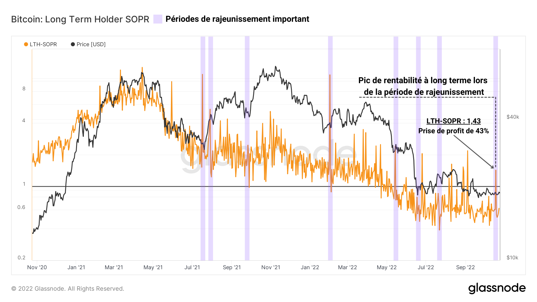 En mesurant le ratio de rentabilité des dépenses des pièces âgées de plus de 155 jours (LTH-SOPR), il est possible de tracer les profits/pertes générés par les dépenses sur une période donnée.