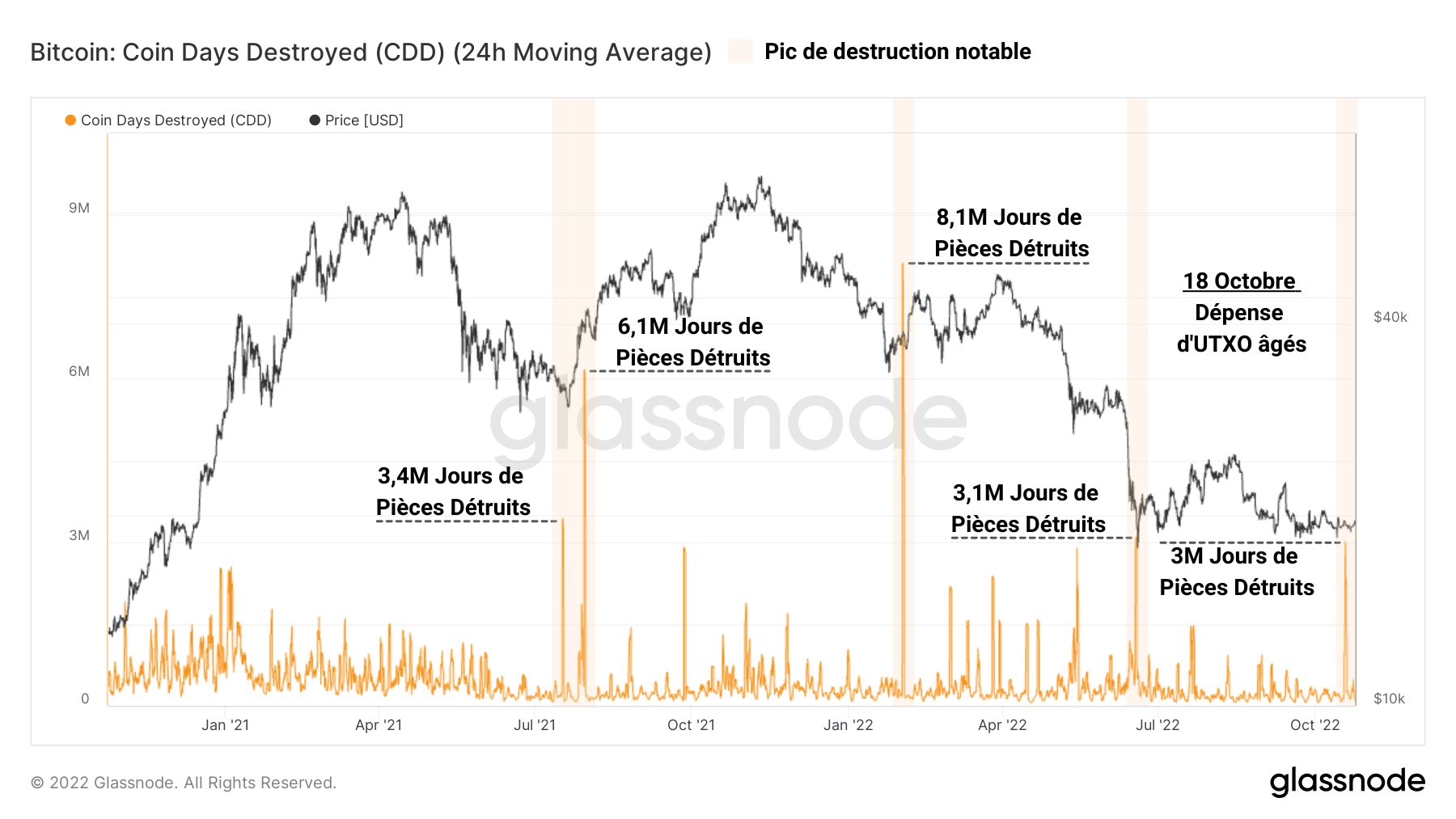 Au premier abord, un pic de destruction de Jours de Pièces (JP) a été enregistré à cette date. Totalisant plus de 3 millions de Jours de Pièces détruits, ce pic est comparable à ceux créés en septembre 2021 (rebond sur les 30 000 $) et en juillet 2022 (rebond sur les 20 000 $).