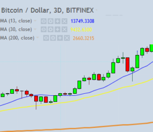 Nous utiliserons aussi les moyennes mobiles. La courbe en bleu est la Moyenne Mobile calculée sur 13 chandelles, pour l'obtenir il faut additionner le prix de fermeture des 13 dernières chandelles et diviser le résultat par 13. Cela nous permet d'obtenir une idée de la valeur moyenne d'une crypto sur une durée de 13 chandelles. Il en va de même pour la courbe jaune, qui est une Moyenne Mobile calculée sur 30 chandelles et de la courbe orange qui est calculée sur 200 chandelles. C'est donc la courbe bleue qui réagit le plus rapidement en fonction du prix. Les moyennes mobiles peuvent être utilisées comme des supports ou des résistances dynamiques. Elles peuvent également nous permettre de confirmer les tendances actuelles et de prédire la suite du cours : si les moyennes mobiles les plus courtes sont au dessus des plus longues, on est en tendance haussière (et l'inverse est également vrai). Enfin, les croisements peuvent annoncer un retournement de situation et faire office de signaux de ventes ou d'achats.