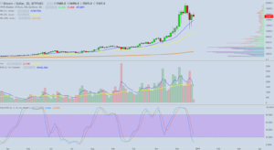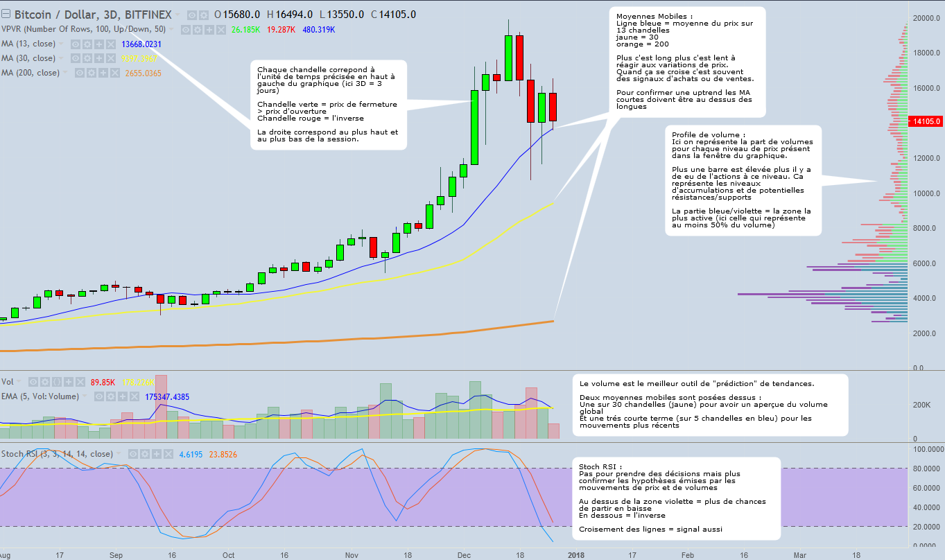 Pour commencer, nous allons principalement utiliser les graphs de TradingView. Je vais me focaliser essentiellement sur des analyses en UT (unité de temps) d'une semaine, de 3 jours et d'1 jour (1W, 3D et 1D). Pour du moyen terme, il n'est pas nécessaire de d'effectuer des analyses sur des périodes plus courtes (minutes et heures). Par contre, il pourrait être intéressant que vous fassiez ces analyses sur des périodes de temps plus courtes au moment où vous souhaiterez prendre le trade pour optimiser votre point d'entrée. Plus on observe les graphs avec une petite UT, moins cela est fiable et plus cela est stressant 😉 Dans la suite de cet article, je vais mettre l'accent sur trois outils/indicateurs que j'utilise pour faire mes analyses : les Moyennes Mobiles, le Volume et le Profile Volume.