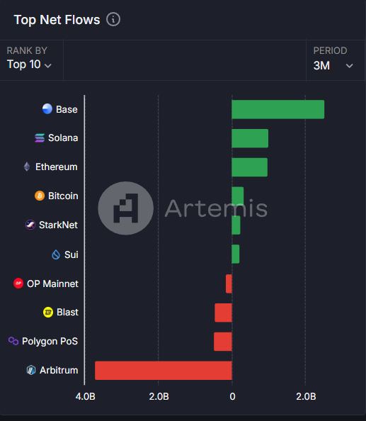 Cependant, ce n'est pas le cas de toutes les blockchains. En effet, le layer 2 Arbitrum, pourtant considéré comme un réseau de seconde couche majeur sur la blockchain Ethereum, accuse des sorties nettes de capitaux colossales. Ces dernières sont estimées à environ 3,7 milliards de dollars au cours des 3 derniers mois selon les données de la plateforme d'analyse on-chain Artemis Terminal :