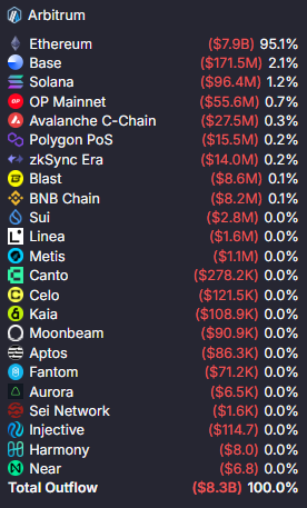 En observant de plus près le détail des outflows de la blockchain Arbitrum, nous voyons qu'une écrasante majorité des cryptomonnaies ont été transférées vers la blockchain Ethereum : ces mouvements représentent 95,1 % des outflows, soit 7,9 milliards de dollars.