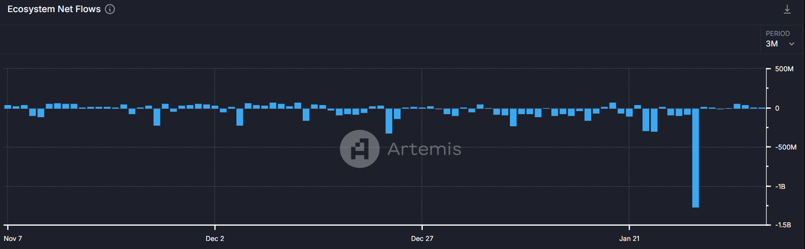 Sur le graphique ci-dessus, nous pouvons constater que plus d'un tiers des flux de capitaux sortants peuvent être imputés à la journée du 29 janvier avec 1,3 milliard de dollars d'outflows.
