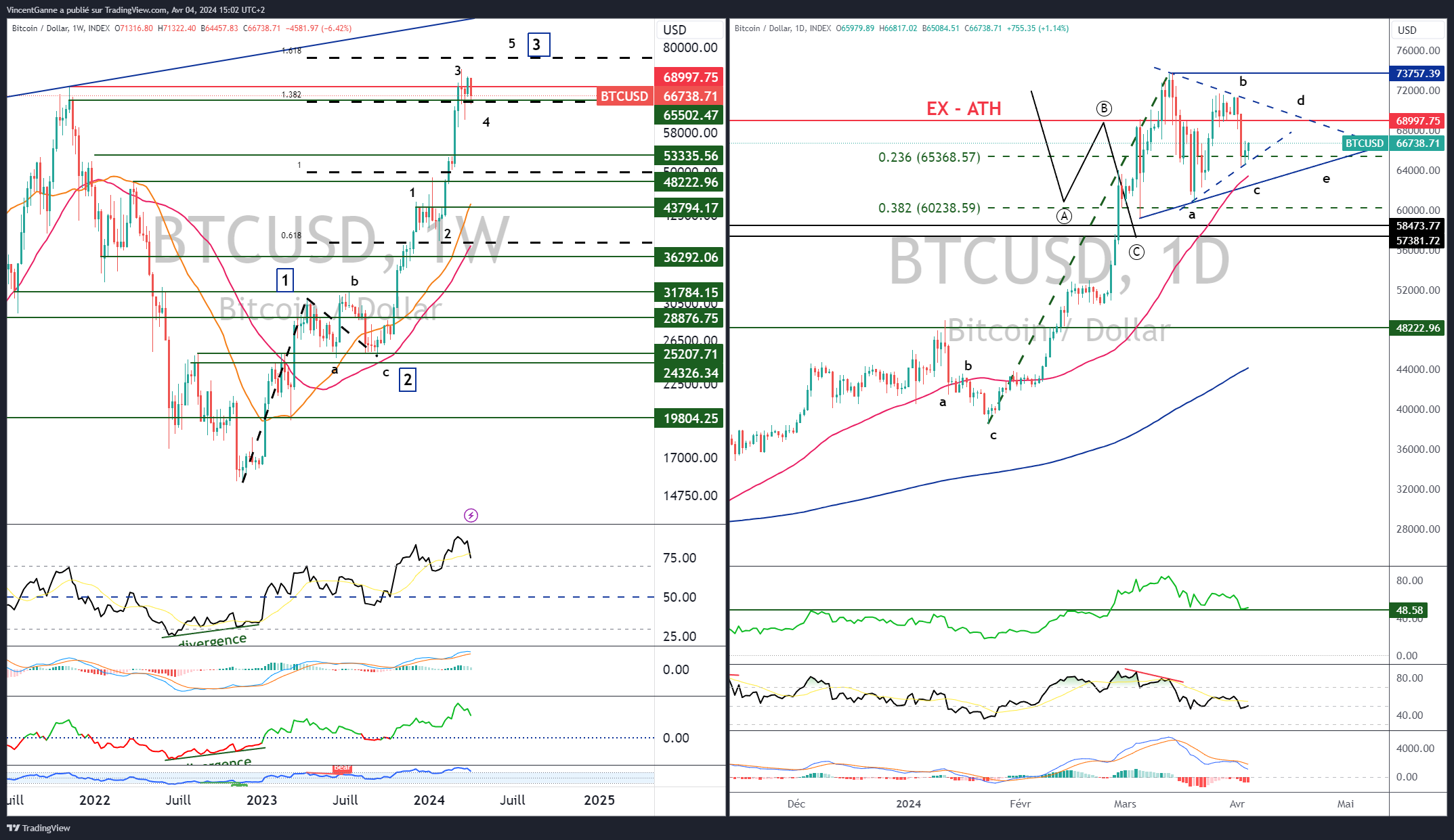 Sur le plan de l’analyse technique, la construction de la vague 4 est une certitude, mais il y a encore plusieurs hypothèses pour l’amplitude et la forme de cette vague de pause. Triangle chartiste, correction en 3 temps de type zig-zag, formation à plat de type « flat », etc… autant de scénarios graphiques sur lesquels je reviens chaque matin et en vidéo sur Cryptoast Research.