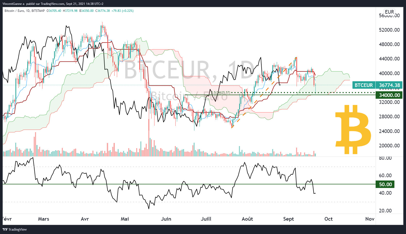 L'échec sous la résistance technique majeure des 52 800 $ a ramené le marché sur les 40 000 $, ce seuil est la frontière entre le camp haussier (celui de la dynamique haussière estivale) et le camp baissier (celui de la chute du printemps dernier).