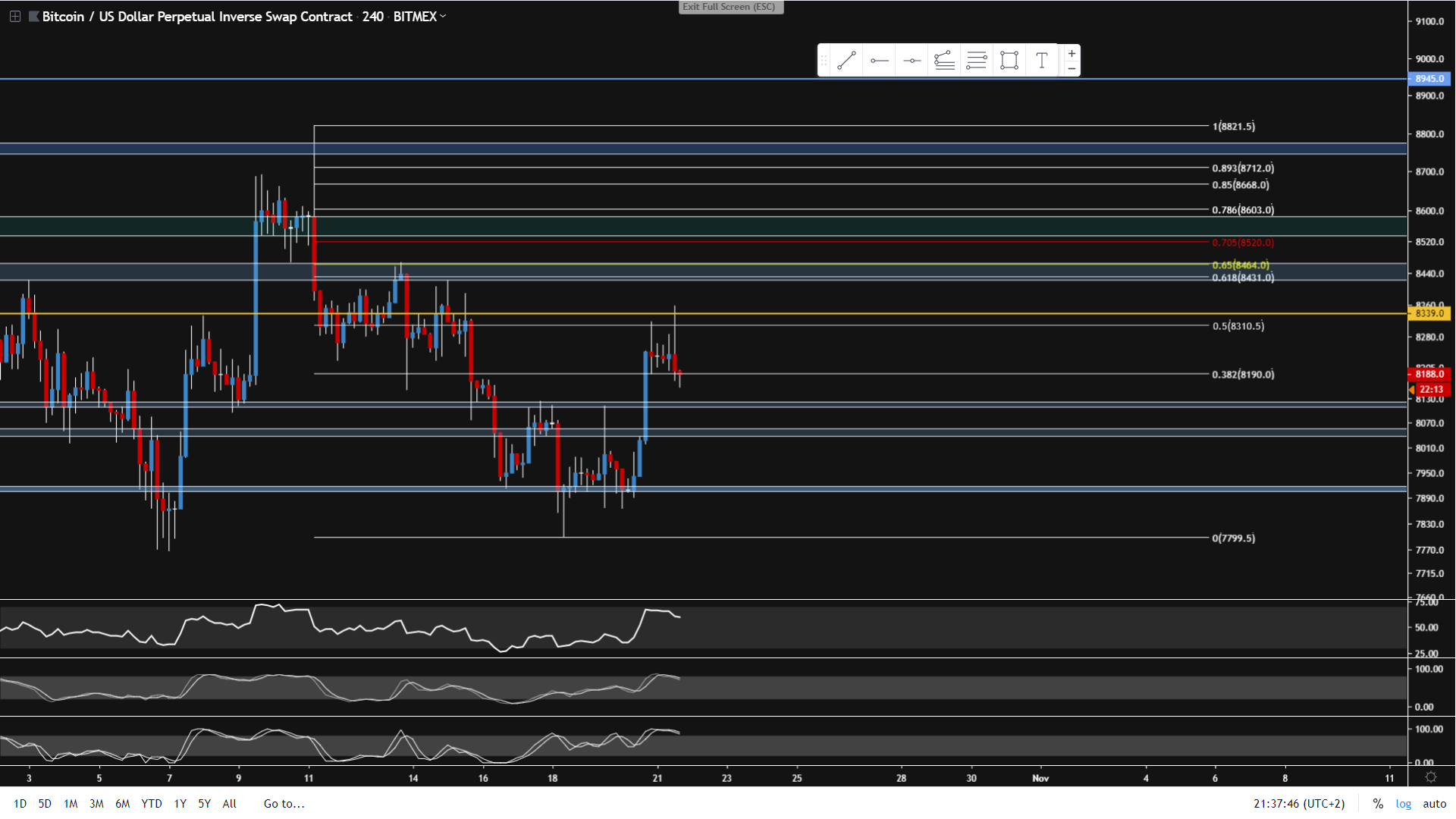Tout d'abord la golden zone 0.618 - 0.65 aux alentours de 8450$, qui correspond à une bande de s/r de ce range sur laquelle nous avons réagit plusieurs fois. La golden zone est la zone comprise entre les retracements 0.618 & 0.65 de fibonacci.