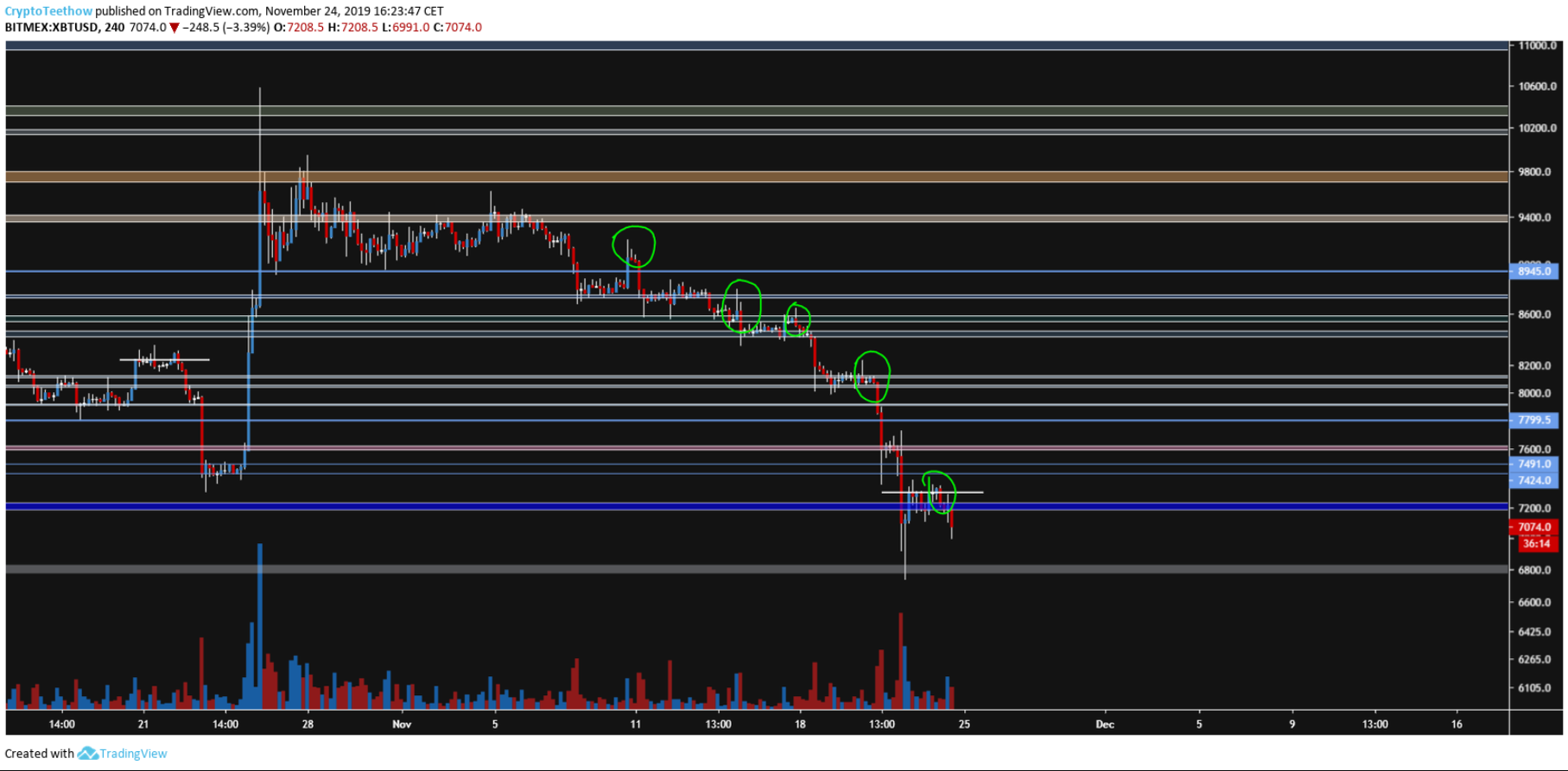Comme vous pouvez le voir, le BTC est dans une tendance baissière depuis le pump phénoménal du 25 octobre. On pouvait penser au début que ça n'était que la correction de ce pump, mais maintenant, force est de constater que nous sommes bien dans une tendance baissière, et pas seulement dans une correction.