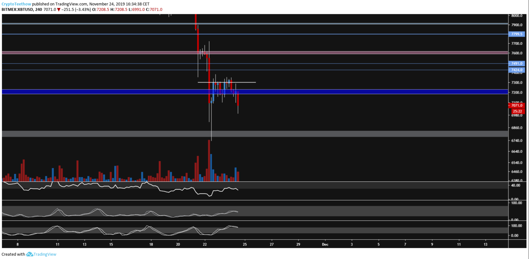 Attention quand même, une cassure des 6800$ amènerait sûrement un désespoir et donc une phase de capitulation, qui pourrait nous emmener tout droit vers les 6000$.