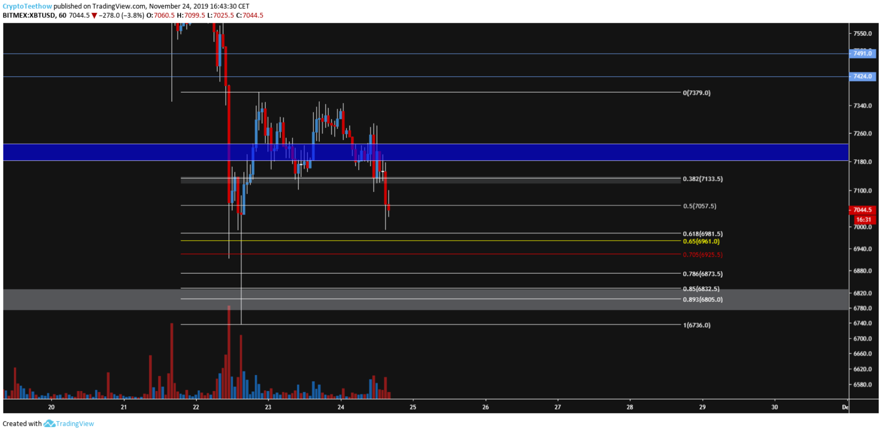 Il faudra voir la réaction à 7130$, au niveau de la 0.382 et d'une petite zone de s/r. Généralement, les actifs réagissent entre ces deux fibonacci, ce qui nous amène à souvent voir des 0.618 to 0.382