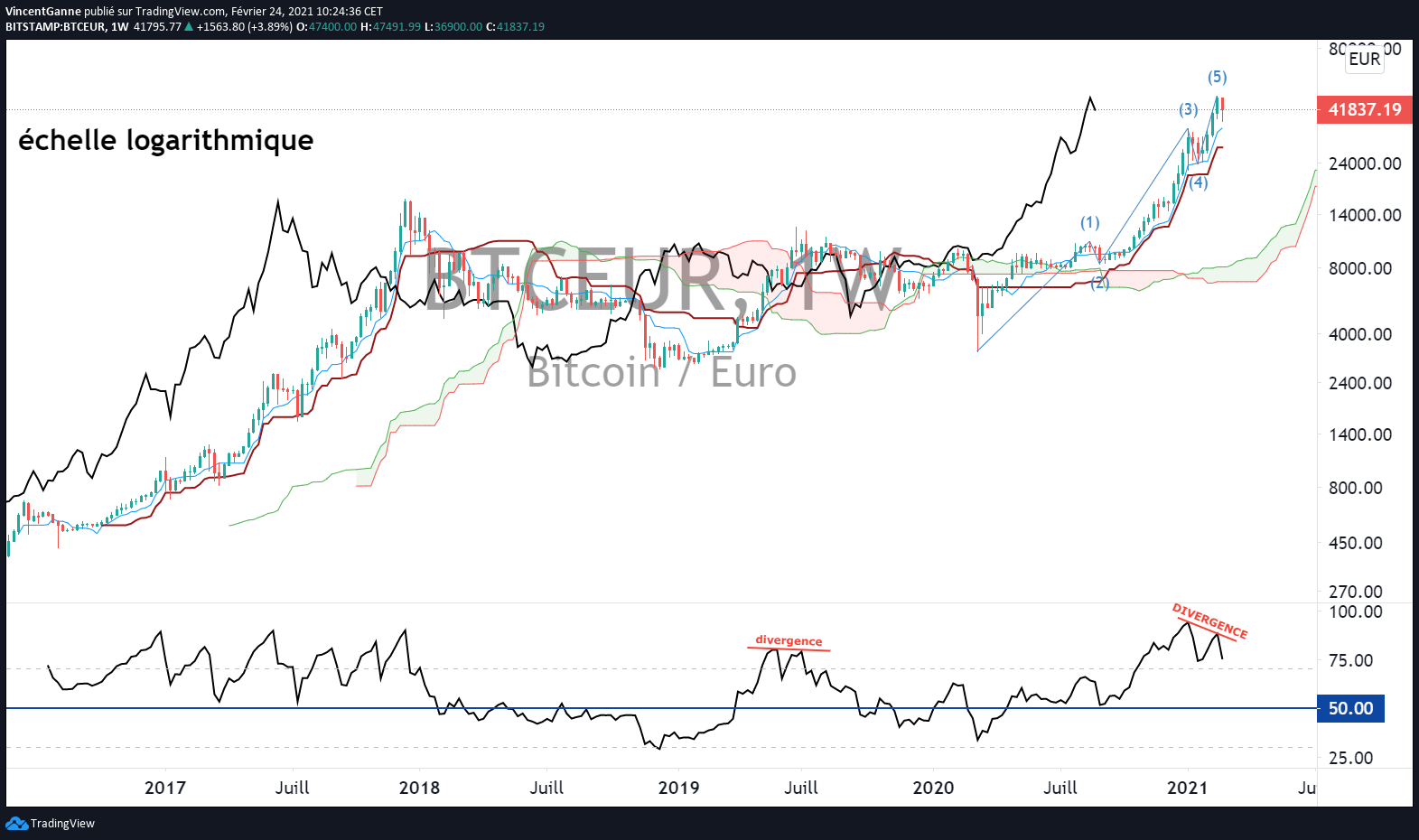 Le Bitcoin se trouve actuellement dans une cinquième vague de hausse depuis le point bas du mois de mars dernier, le choc boursier causé par la pandémie de Covid-19. Cette cinquième vague voit l'apparition d'une divergence baissière prix/momentum, j'estime donc que le marché devrait marquer une pause entre le support à 42 000 $ et les records historiques.