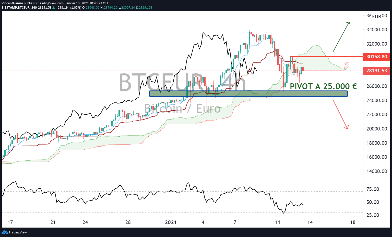 À très court terme, le pivot se situe à 25 000 € comme le montre le graphique intraday ci-dessous sur le ratio BTC/EUR. Certains chartistes y voient une configuration en épaule-tête-épaule, d'autres n'y voient rien sauf une pause latérale. Dans tous les cas, c'est la résolution de l'intervalle 25 000 / 30 000 € qui donnera le signal du prochain mouvement.