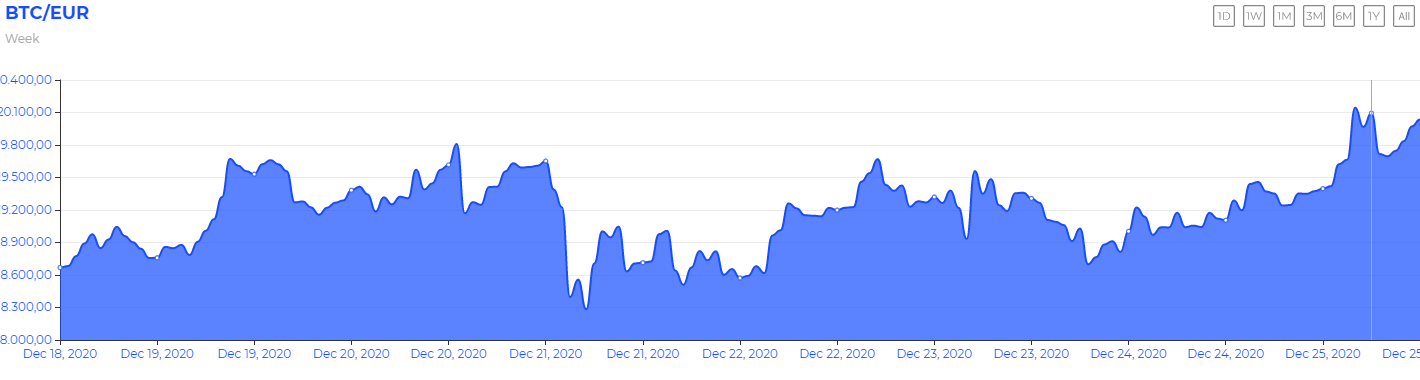 Bitcoin (BTC) dépasse pour la première fois les 20 000 € le jour de Noël