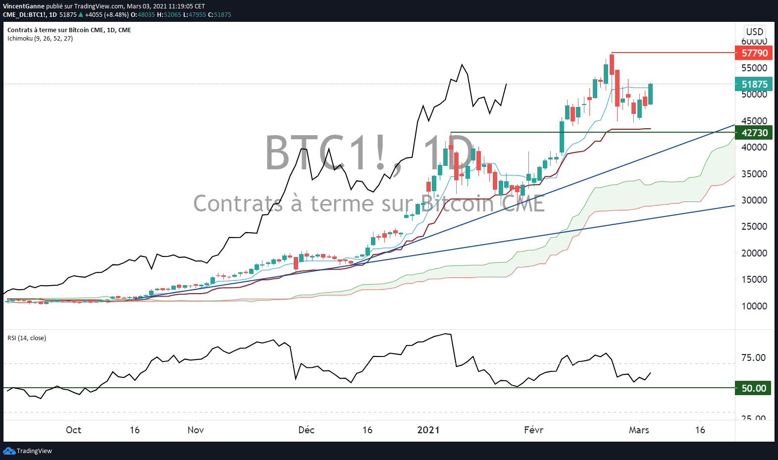 Cours des contrats à terme sur Bitcoin sur le marché de CME - Source : TradingView