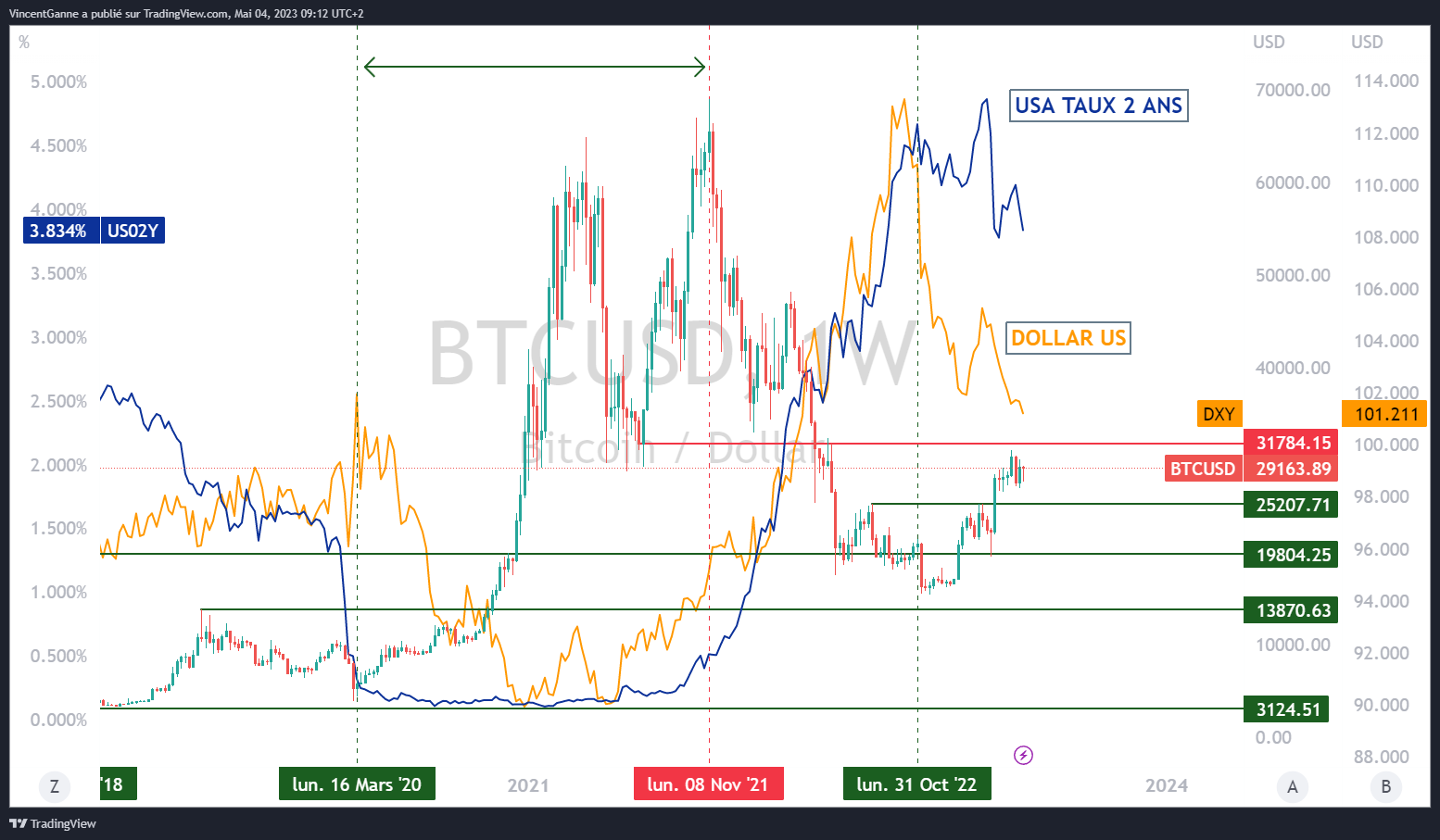 Cette première semaine du mois de mai est très chargée sur le plan des fondamentaux avec les nouvelles hausses de taux de la FED et la BCE et la publication vendredi du rapport NFP aux Etats-Unis. L’augmentation de la probabilité d’une récession US amène le marché à pricer un pivot de la FED dès cet été 2023. Quel impact envisager sur la tendance du cours du Bitcoin (BTC) ?