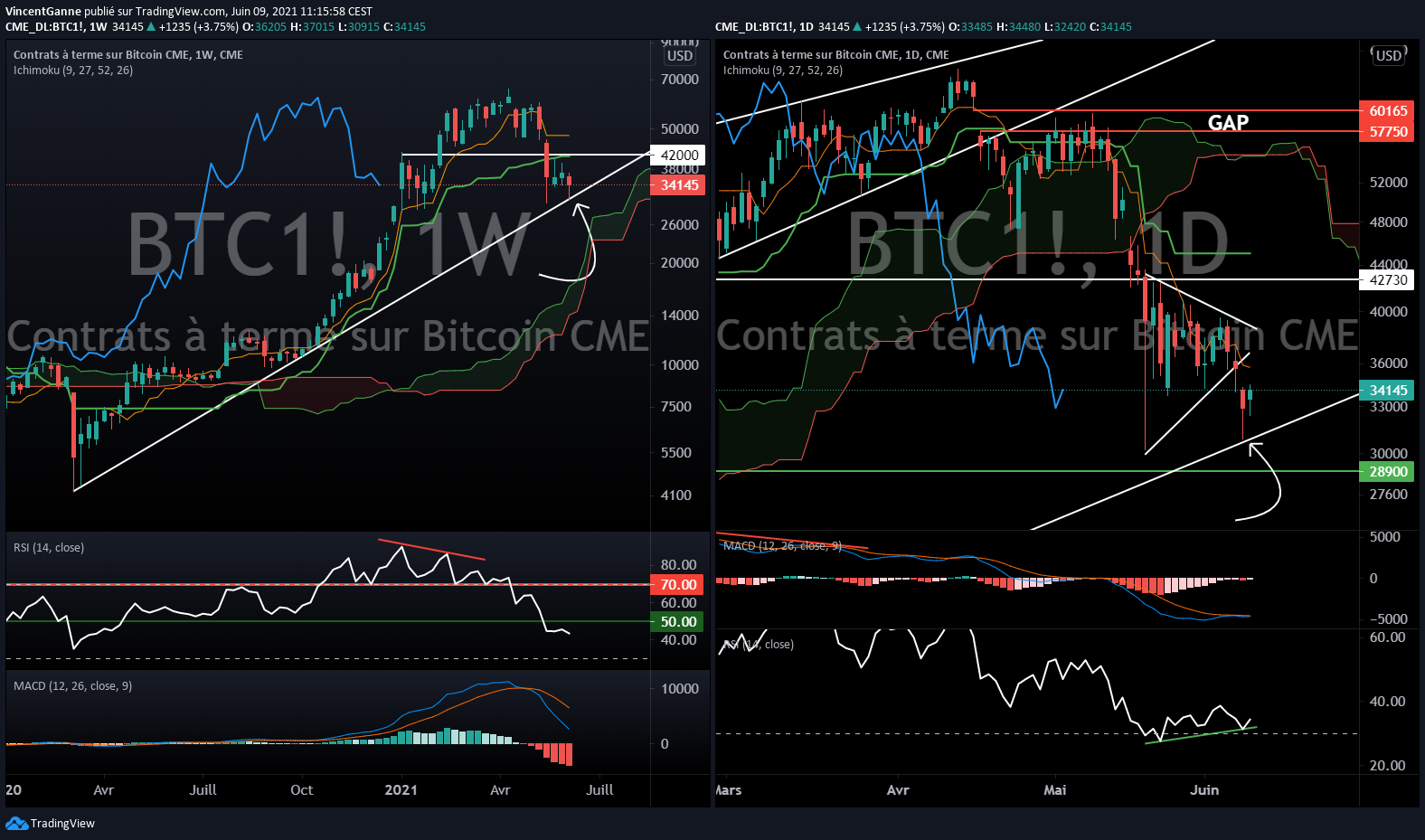 Cette ligne de tendance a été testée hier sur le contrat future Bitcoin, c'est le dernier rempart technique contre un retour du marché sur l'ex-ATH, soit les 20 000 $. C'est le moment de vérité technique, ce seuil doit permettre de rebondir et de s'attaquer à la résistance des 42 000 $, sinon la chute va se poursuivre.