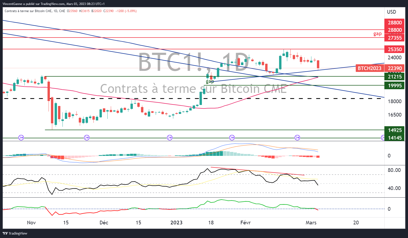 En revanche, le retracement depuis les 25 000 dollars prend de l'amplitude, avec une récente bougie à 22 200 dollars. Il faut que le marché parvienne à préserver le support à 21200 dollars pour éviter de subir un fort décrochage.