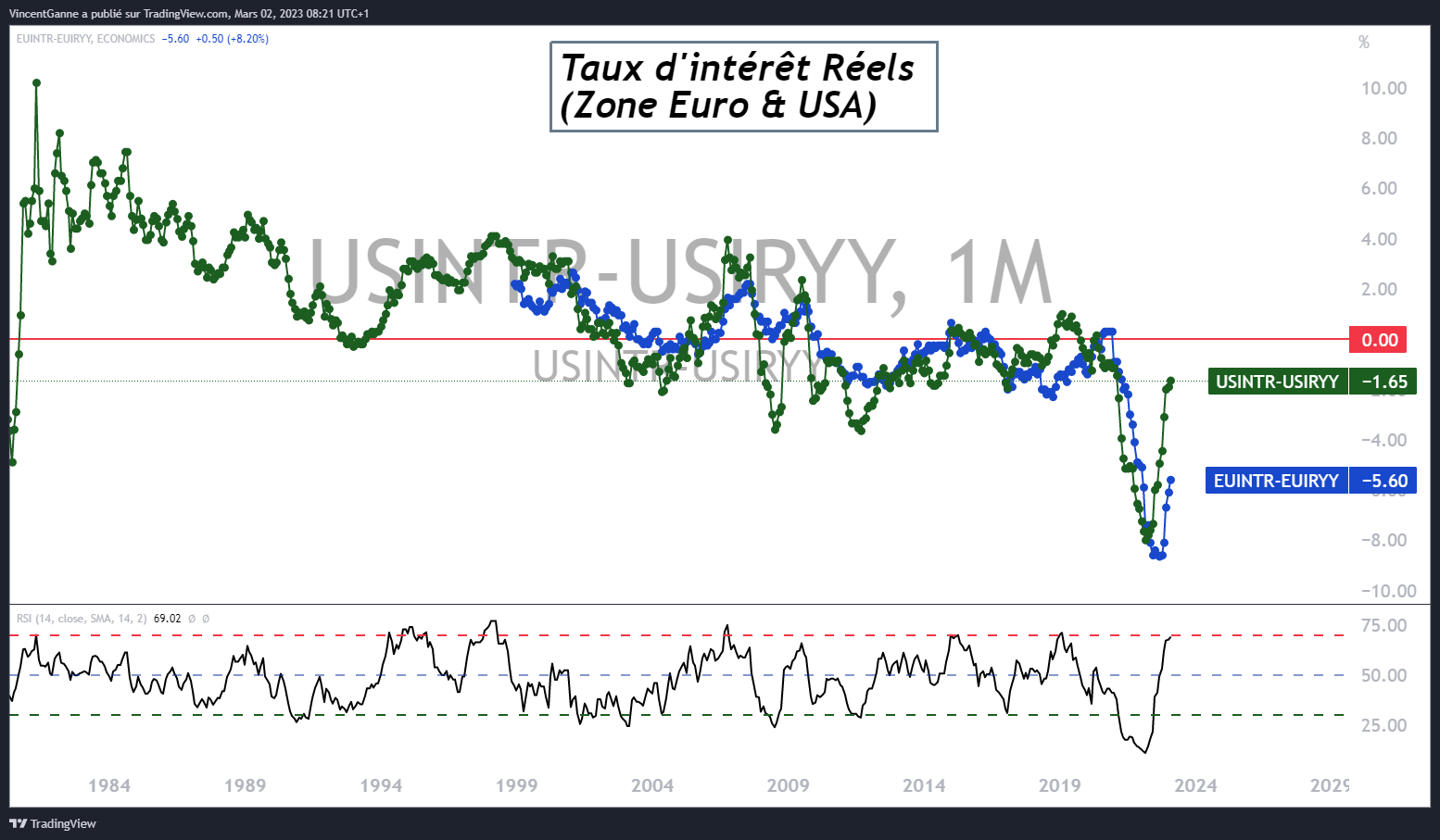 Graphique qui expose les taux d’intérêt réels au sein de la Zone Euro et pour les Etats-Unis