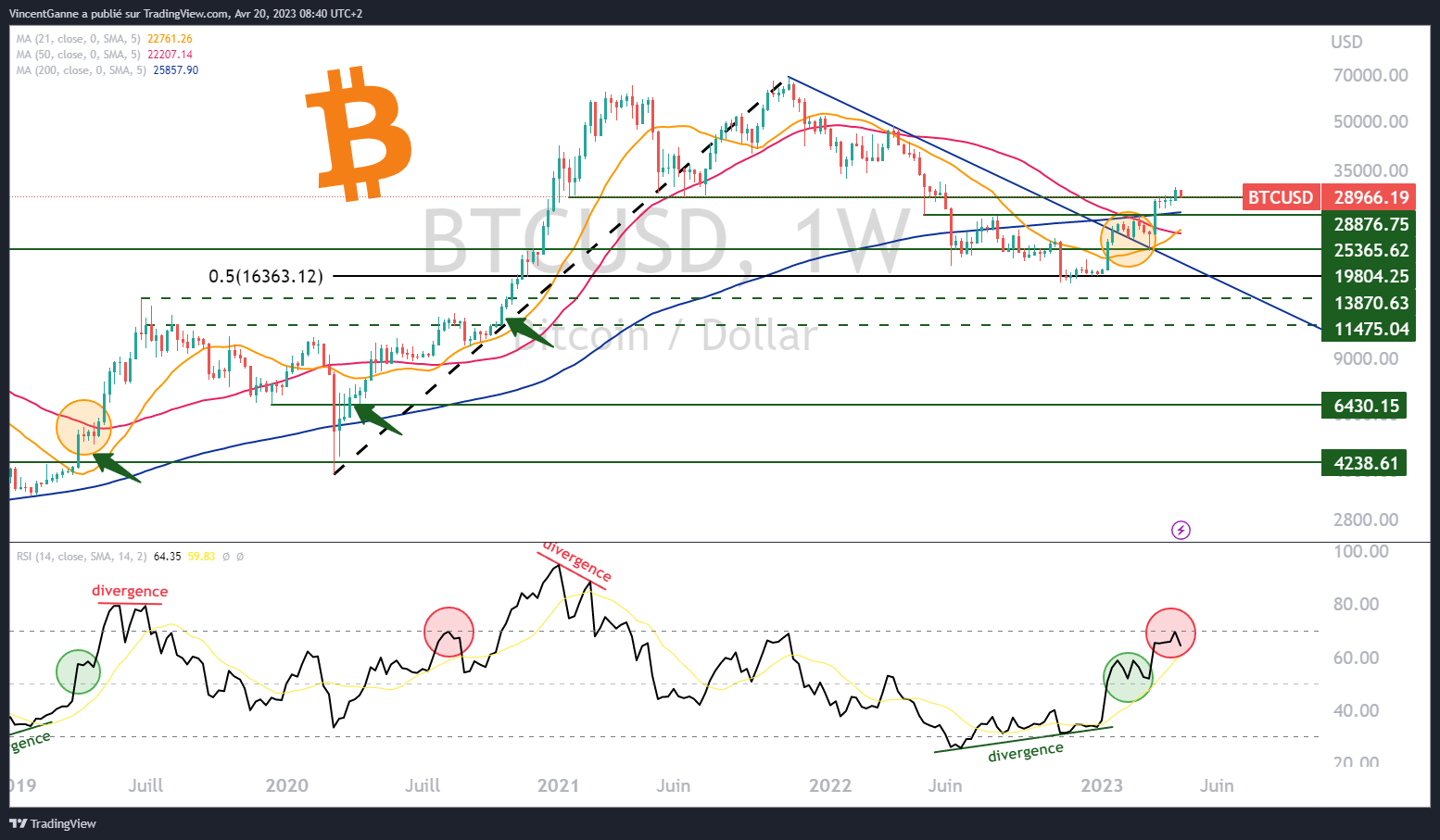 Le mouvement haussier annuel du cours du Bitcoin, dopé par la crise bancaire du mois de mars, est-il en train de s’essouffler au contact des 30 000 dollars ? Afin de juger de la dynamique de fond du BTC, il faut se tourner vers la représentation graphique en données hebdomadaires, l’horizon de temps qui permet de se projeter sur plusieurs semaines.