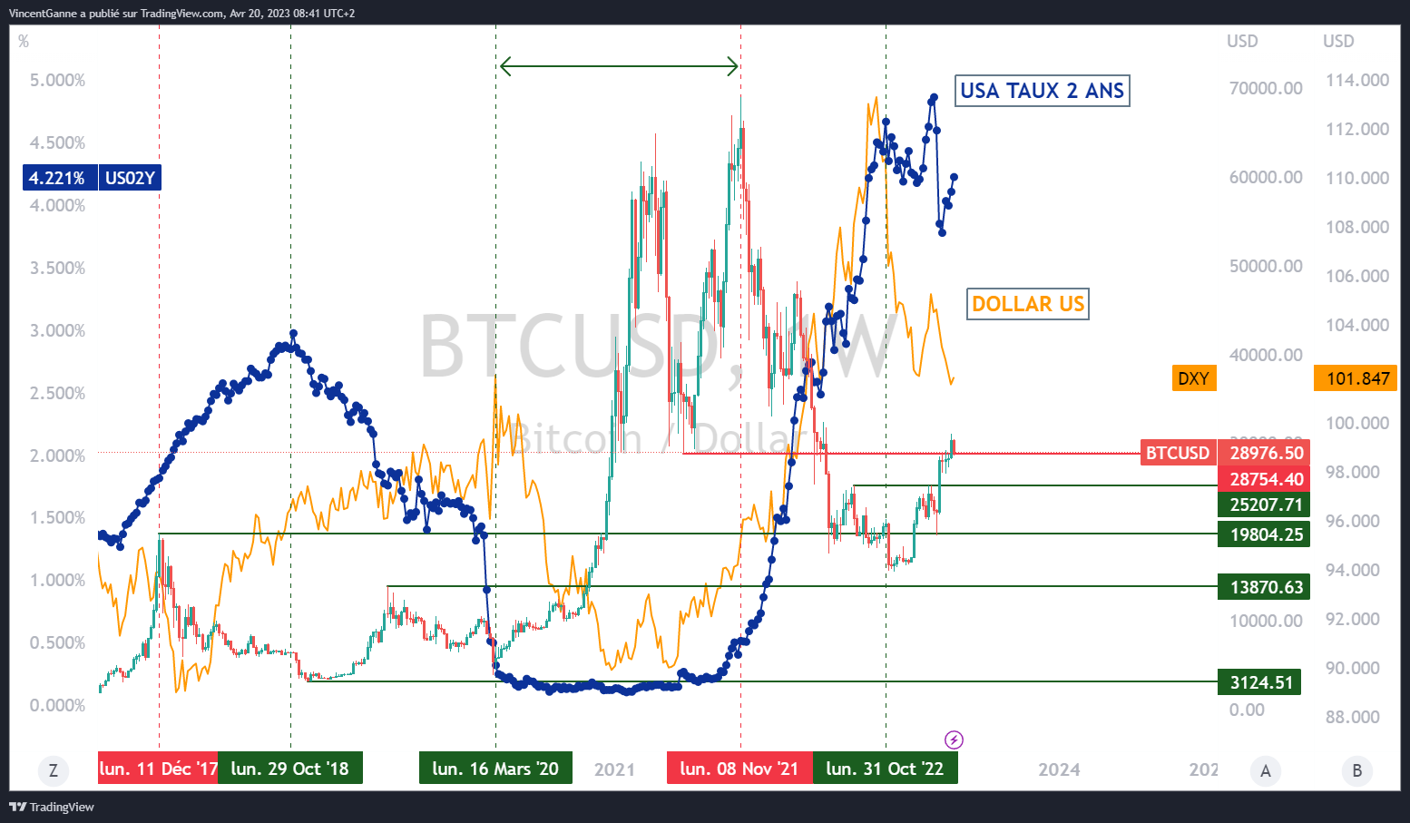Graphique qui compare le cours hebdomadaire du bitcoin en échelle arithmétique avec le taux d’intérêt à 2 ans US et la courbe du dollar US sur le Forex