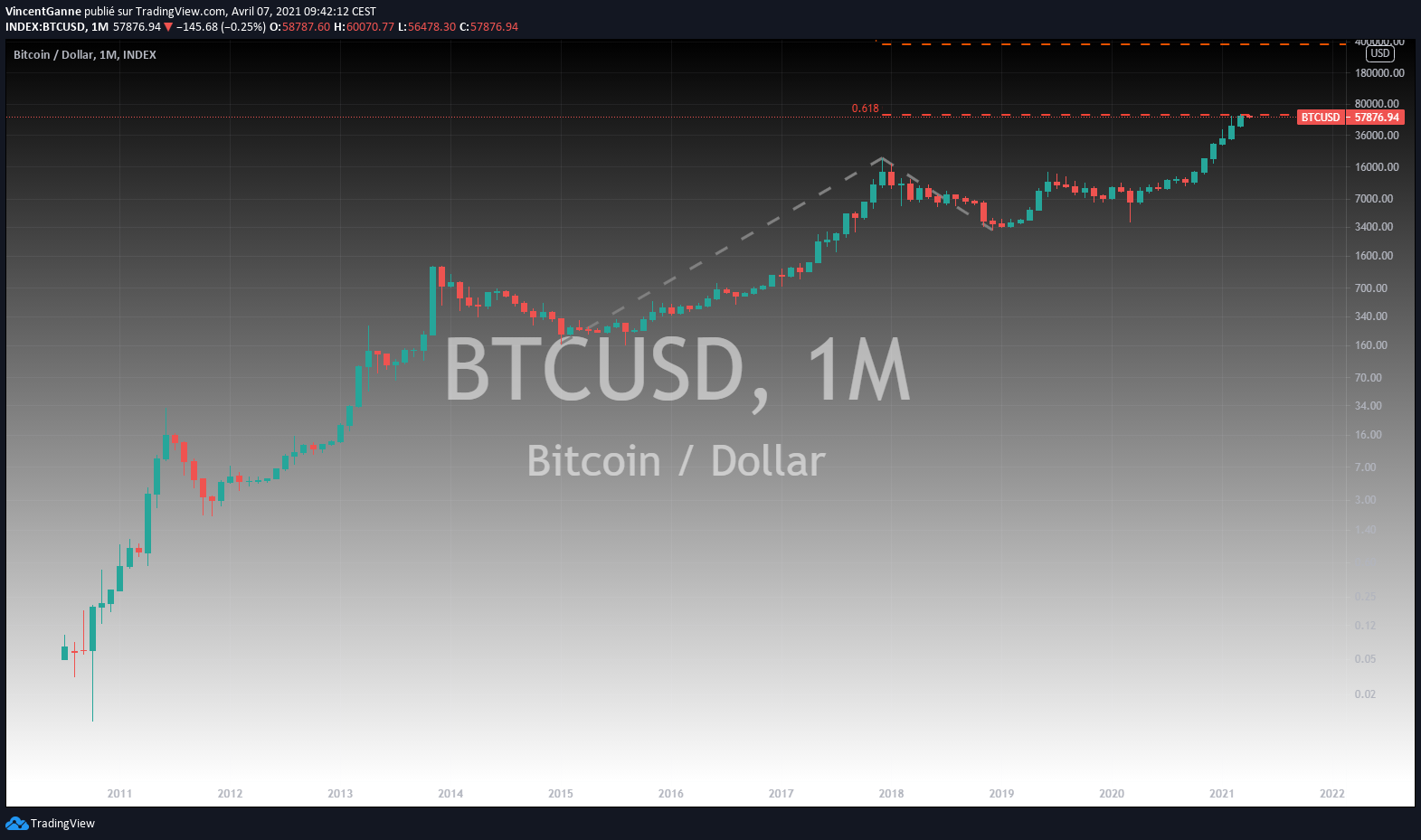 En revanche, j'insiste à nouveau sur la portée de cette résistance à 60 000 $, elle correspond à une extension Fibonacci de 0,618 du bull run des années 2015/2017, c'est donc une étape technique de premier rang.