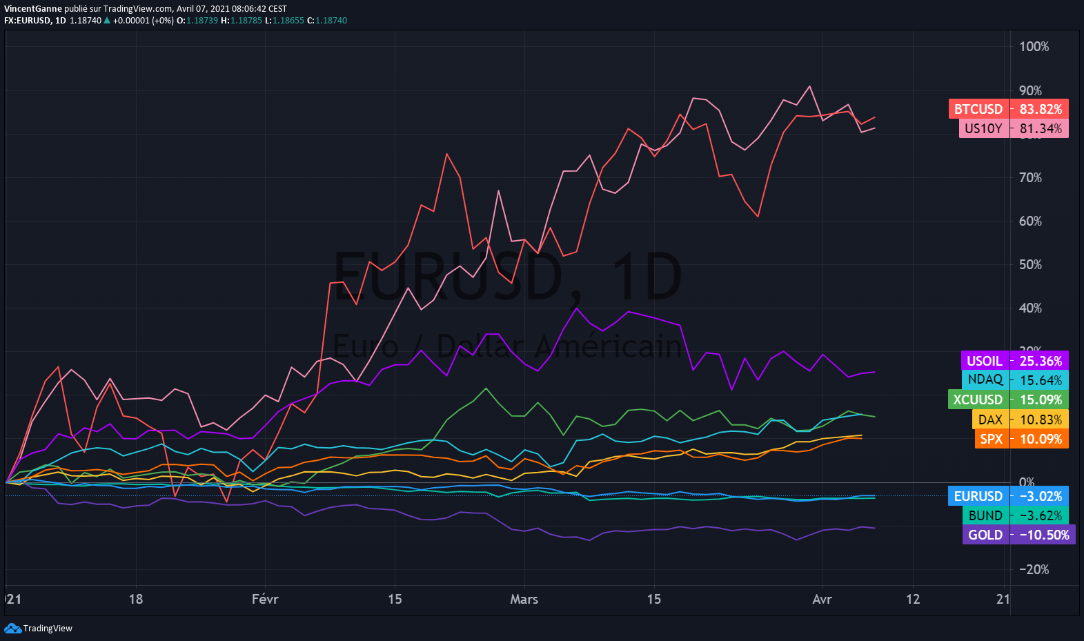 C'est ainsi que depuis le début de l'année, l'once d'or et les obligations corrigent, alors que le Bitcoin, les actions, le pétrole et les taux d'intérêt sont en hausse soutenue. Vous noterez que le cours du Bitcoin occupe la première place avec une performance de plus de 80% depuis le 1er janvier.