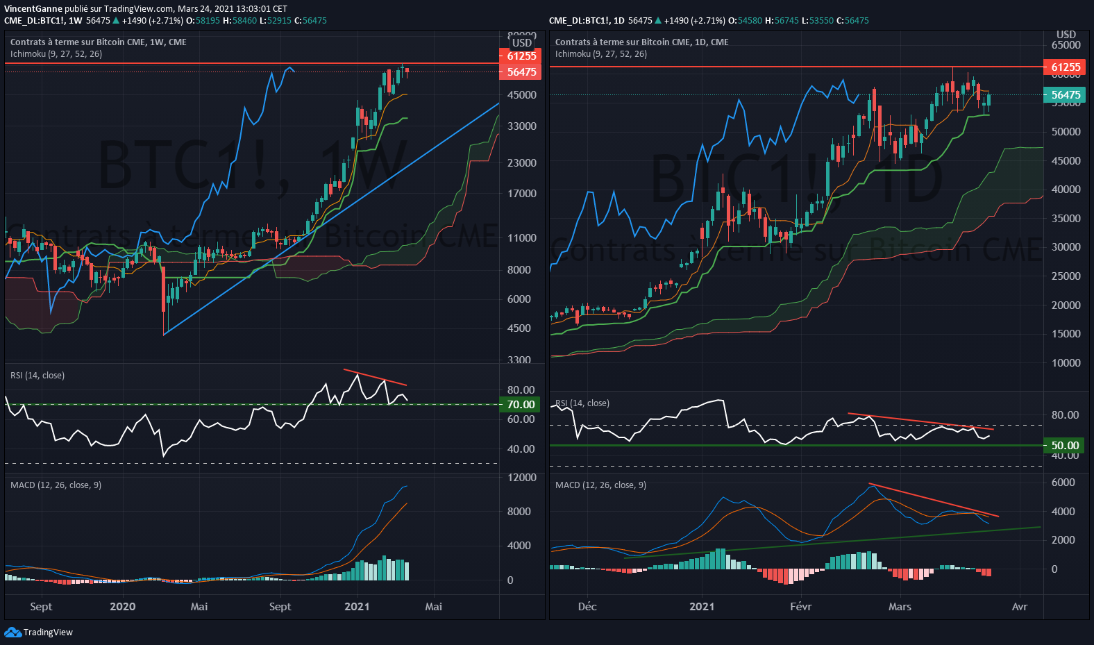 Le cours du Bitcoin (BTC) voit sa tendance haussière ralentir depuis le début du mois de mars, avec un marché qui reste couvert par la résistance technique majeure des 60 000 $ / 62 000 $ et qui est sous l’influence d’une divergence baissière potentielle (j'insiste sur ce sujet, elle n’est pas encore active, vous trouverez davantage de détails dans ma dernière vidéo d’analyse technique).