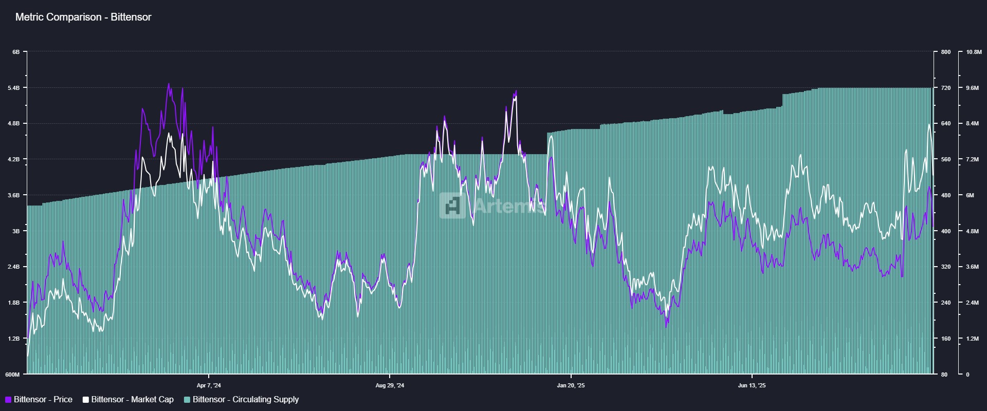 Il est important de rappeler que si le prix du TAO reste à près de - 44 % de son ATH, sa valorisation totale n'est qu'à - 26 %, en raison des émissions continues du token. Autrement dit, l'offre en circulation a augmenté, ce qui maintient la valorisation globale proche de son sommet malgré un prix unitaire plus bas.