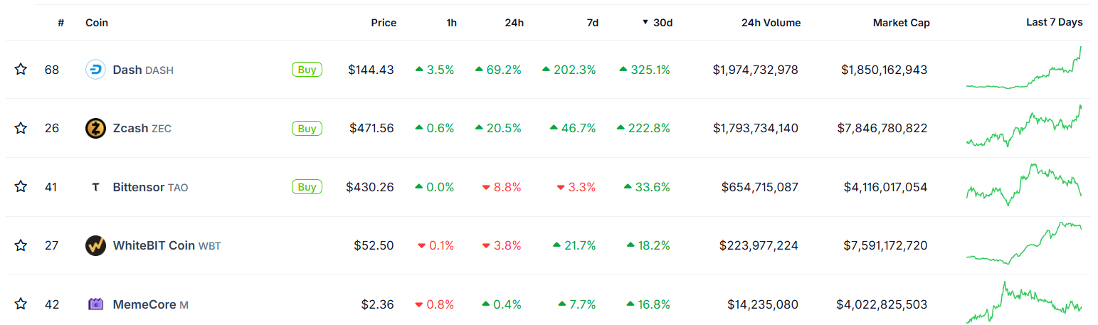 Parmi les 5 cryptos à afficher les plus importantes performances au cours du mois d'octobre nous pouvons citer M, WBT, TAO, ZEC et DASH :