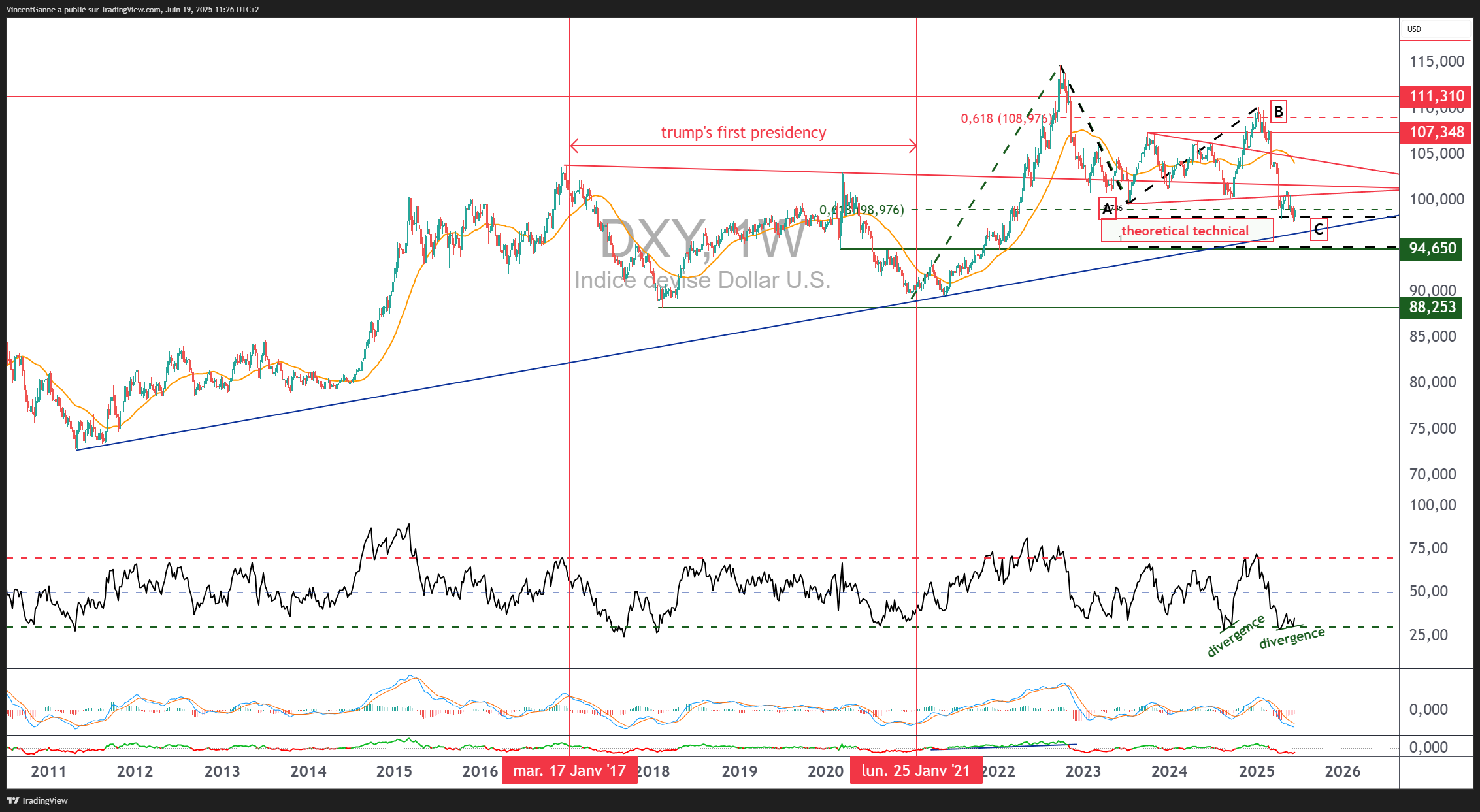 Pour l’heure, aucune cassure de résistance significative n’a été observée. Toutefois, un signal technique haussier potentiel, sous forme de divergence sur les graphiques hebdomadaires, attire l’attention des analystes. Ce type de configuration a déjà précédé par le passé un rebond du dollar face aux principales devises mondiales.