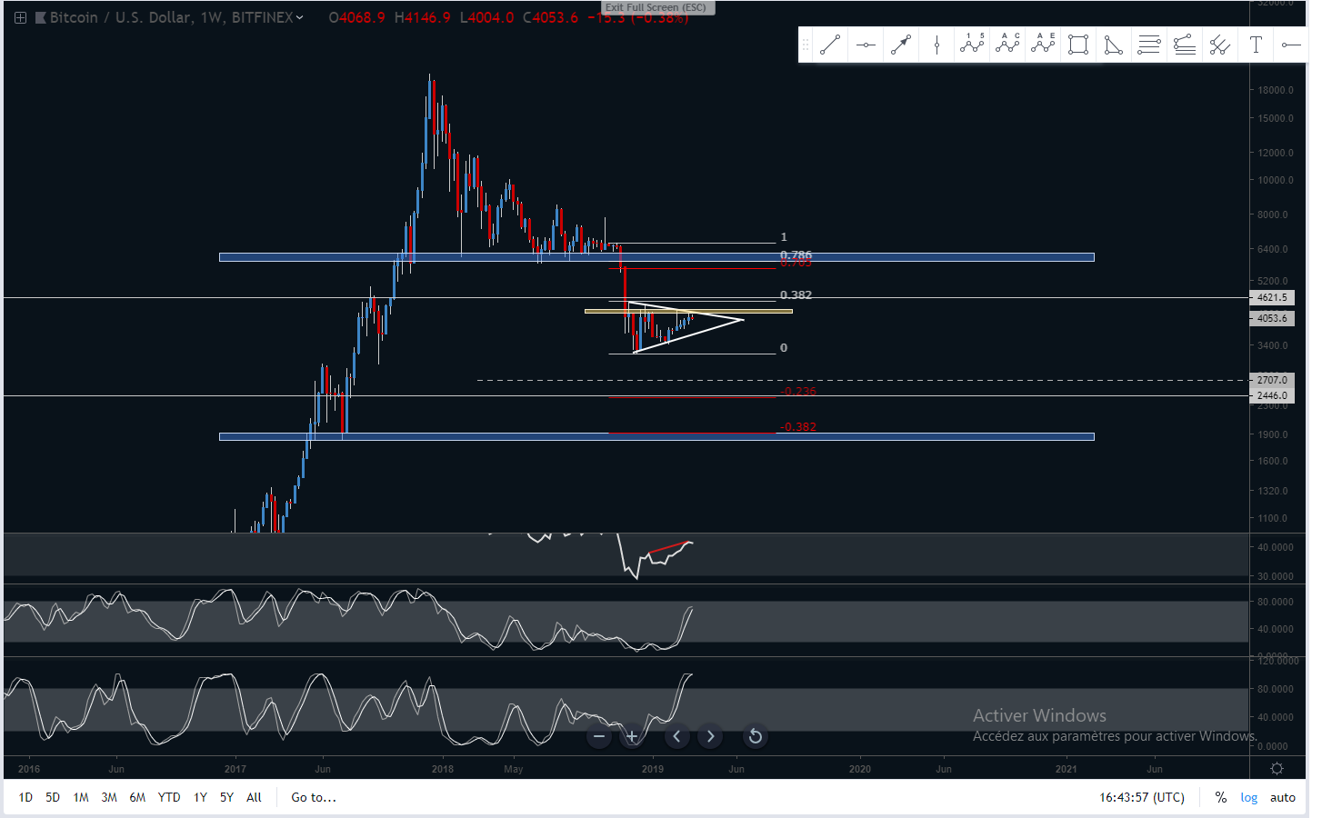 Concernant les fibos, il y a des belles confluences au niveau des résistances/supports avec notamment la fibo -0.236 situé sur l'énorme support weekly à 2500$, puis la -0.382 situé encore une fois sur un support monstre au niveau des 1800$, ainsi que la 0.382 au niveau d'une belle résistance à 4600$.