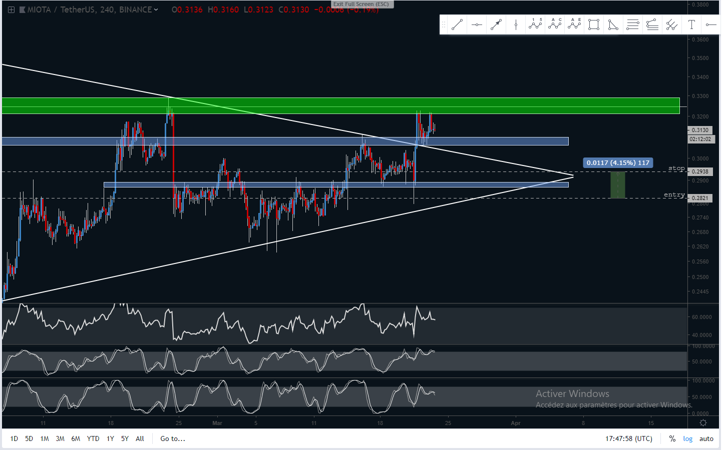 Sur cette timeframe, nous voyons très bien les deux grosses chandelles vertes qui ont permis de casser ce triangle, ces deux chandelles ont drastiquement fait remonter les indicateurs, notamment les stochastiques qui sont toujours très haut à l'heure actuelle. Nous avons fait ce qui s'apparente à un petit pullback de la trend au niveau de la zone bleue avant de remonter sur la zone verte, zone que l'on doit absolument passer si l'on souhaite atteindre les targets précédemment citées.