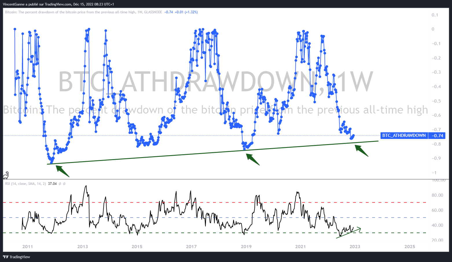 Malgré l’ensemble de ces données fondamentales baissières pour le marché crypto, le cours du Bitcoin (BTC) tente toujours de se stabiliser, permettant ainsi de préserver la configuration en divergence haussière potentielle entre le prix et le momentum (représenté ci-dessous par l’indicateur technique RSI) moyen terme.
