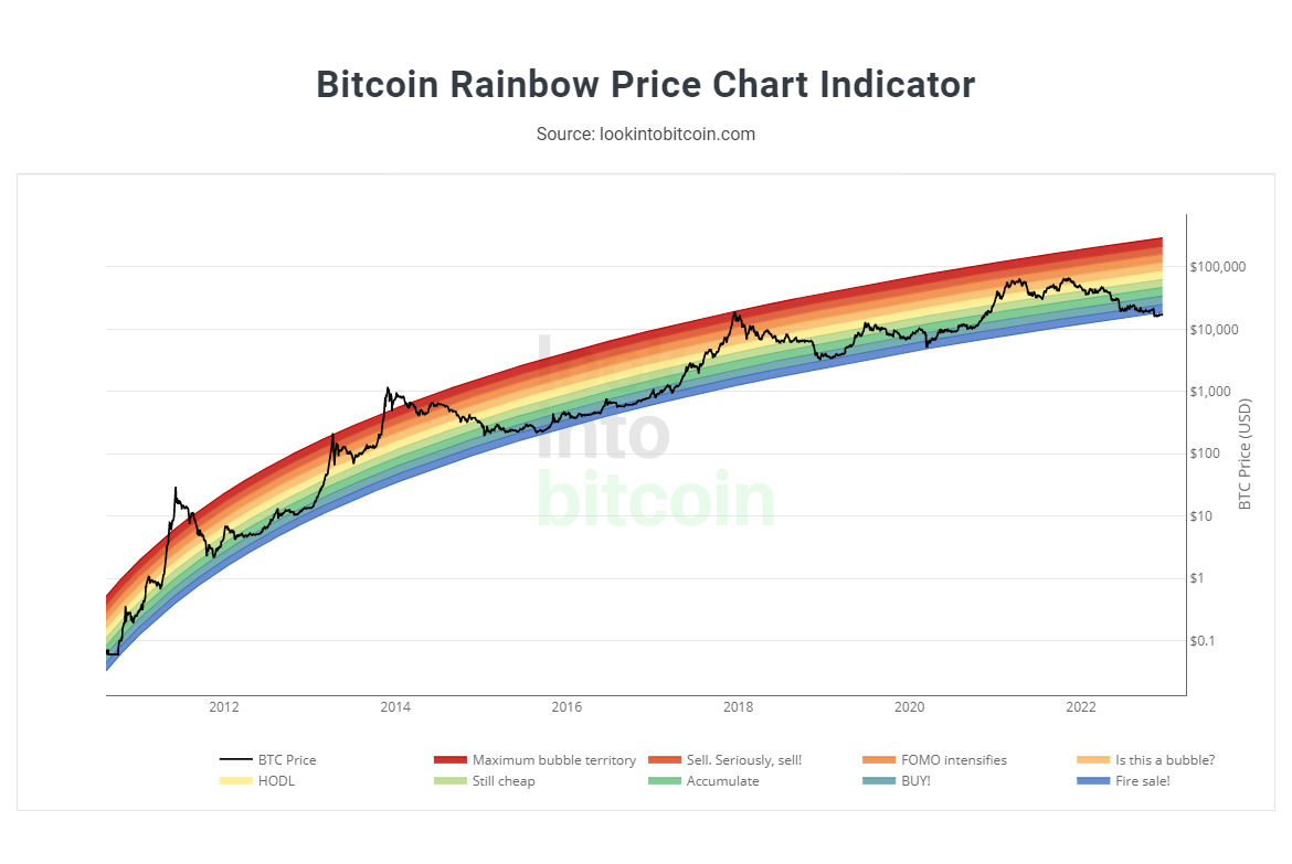 Graphique qui expose l’indicateur Bitcoin Rainbow avec le cours du bitcoin (courbe noire)