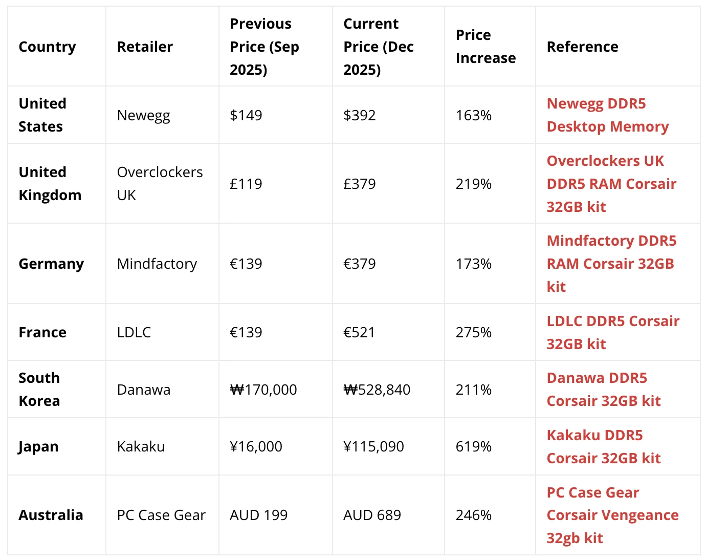 Le module DDR5 de 32 Go a par exemple connu une hausse spectaculaire sur tous les marchés, les prix américains sont passés de 149 $ à 392 $ (+163 %) et ceux du Japon ont connu la hausse la plus extrême, passant de ¥16 000 à ¥115 090 (+ 619 %).