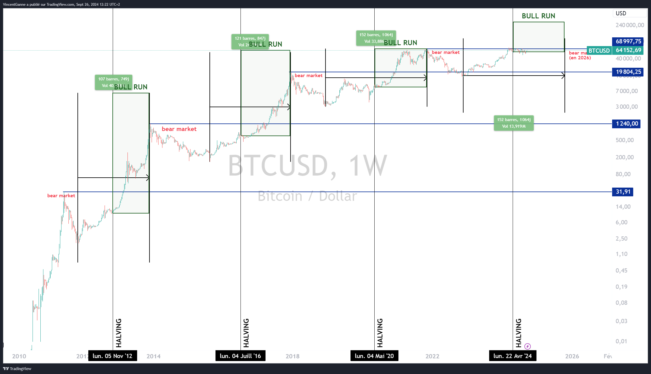 Je pense que la cible technique des 100 000 dollars peut être faite d’ici le 24 décembre 2024 et je vous publie ci-dessous un graphique de long terme qui rappelle l’alternance des cycles haussiers et baissiers de Bitcoin en lien temporel avec le halving quadriennal.