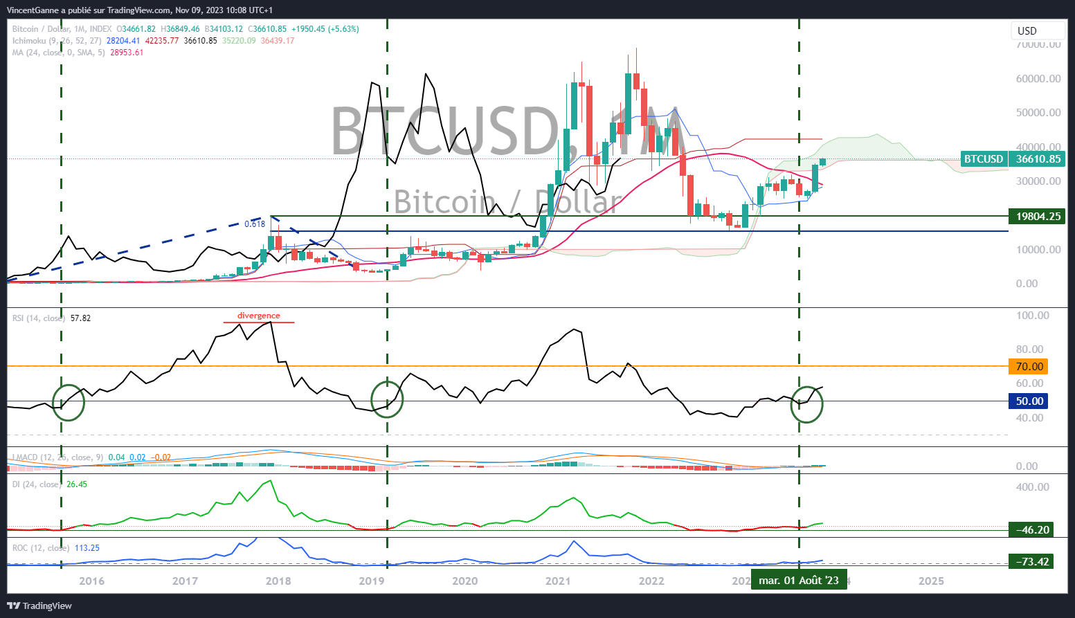 Le graphique en données mensuelles (voir le graphique ci-dessous) permet de constater le renversement haussier classique bien mis en évidence par le système Ichimoku. Ce système d’analyse de marché pointe le niveau des 42 000 dollars comme l’ultime verrou à faire sauter pour déclencher la phase principale du bull run.