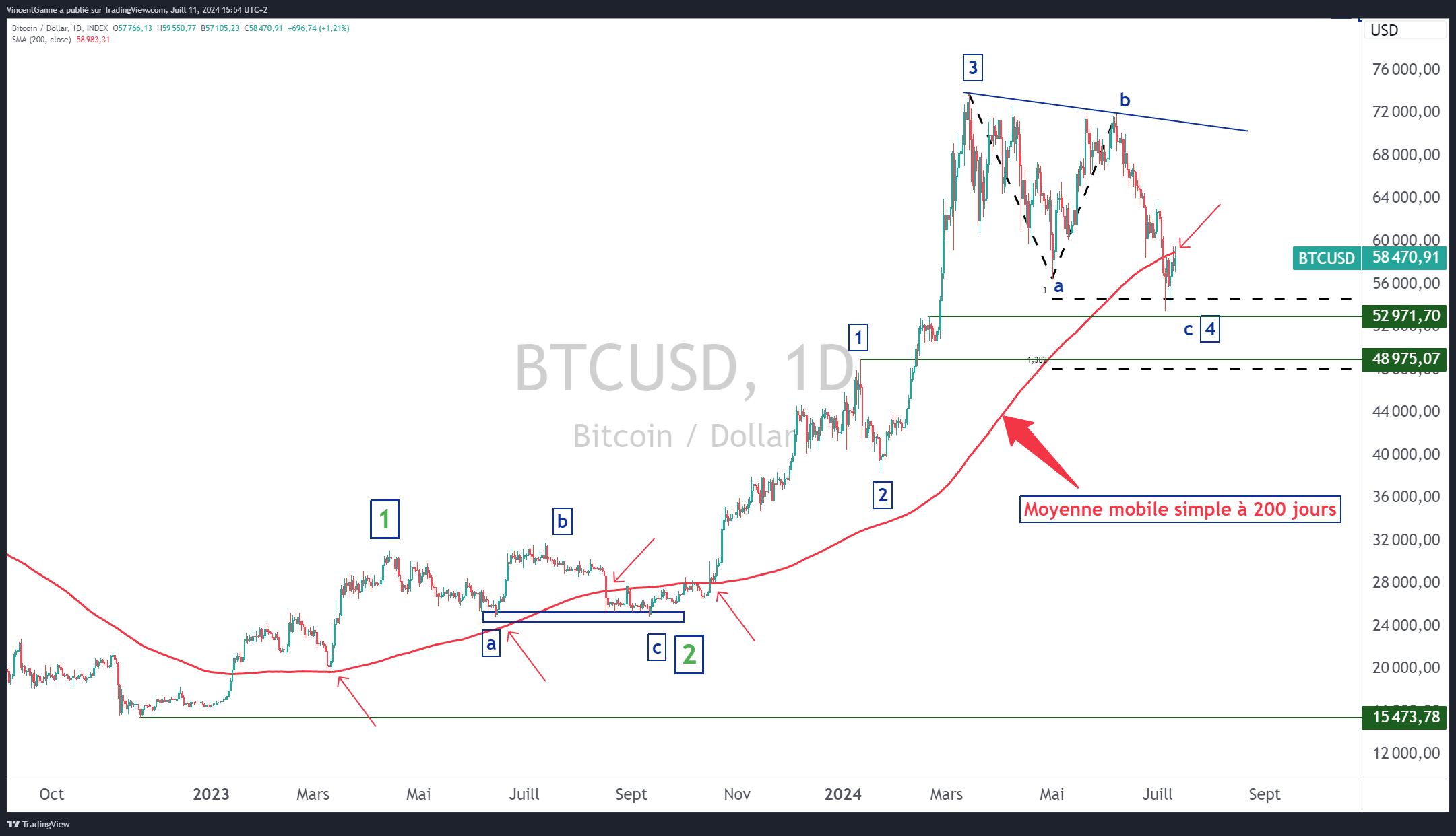 Le signal du fort redémarrage de la hausse sera donné par le dépassement des moyennes mobiles à 200 jours, soit les 59 000/60 000 dollars.