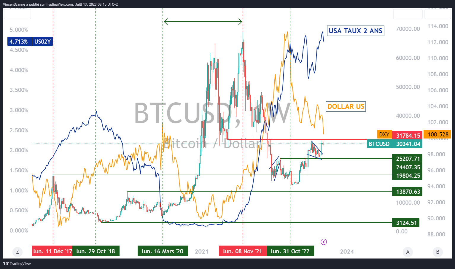 Cours du Bitcoin en données hebdomadaires avec la tendance du dollar (DXY) sur le Forex et le taux d’intérêt obligataire des États-Unis sur 2 ans