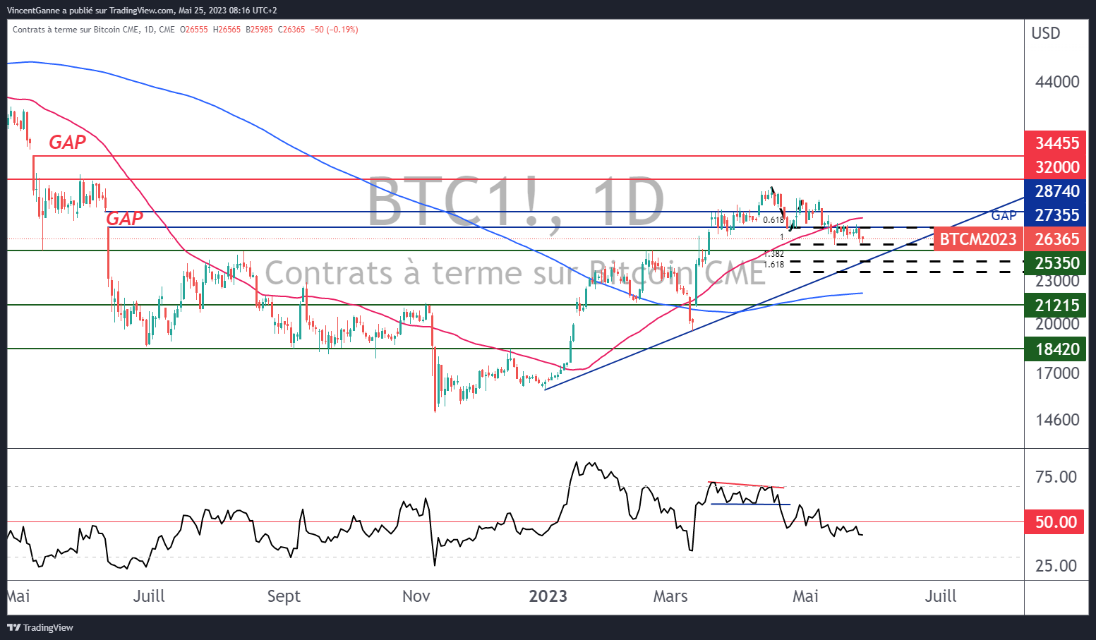 Graphique réalisé avec le site TradingView et qui expose le cours du contrat future bitcoin en bougies japonaises quotidiennes