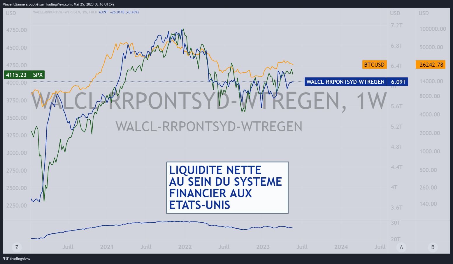Graphique réalisé avec le site TradingView et qui expose l’évolution du montant général de liquidités nettes sur les marchés financiers US, avec en corrélation le cours de l’indice S&P 500 et le cours du bitcoin