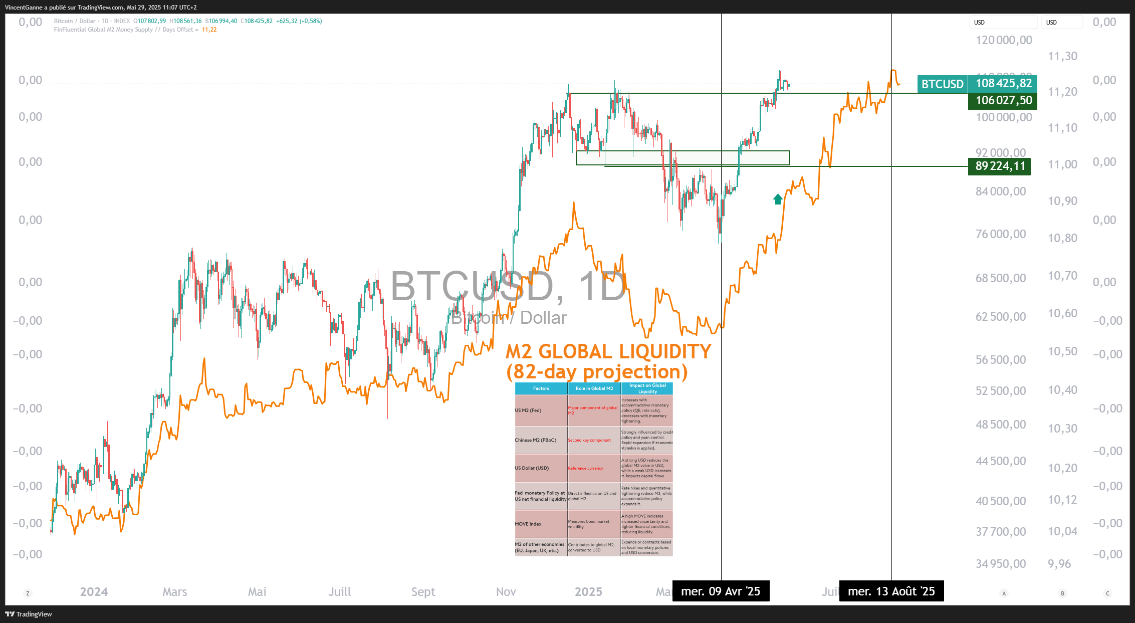 Cette mécanique est bien en place dans le cycle actuel. Le nouveau sommet atteint par le M2 mondial fin mai indique donc, à horizon août, un potentiel haussier maintenu pour le BTC, tant que cette corrélation reste valide.
