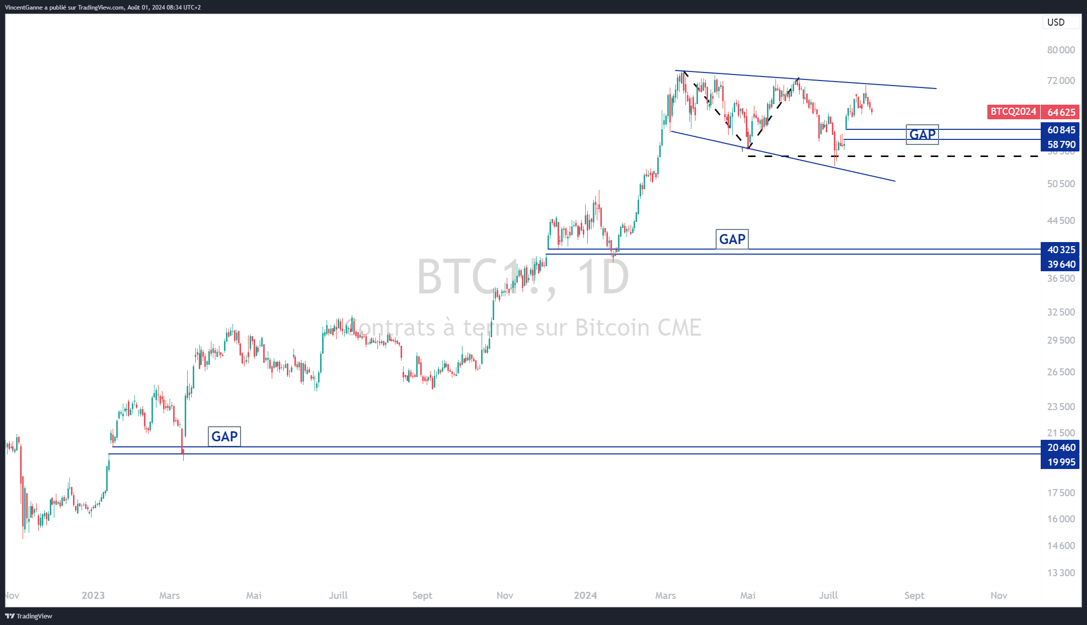 À court terme, la question de la fermeture du gap haussier laissé ouvert sur le CME en début de mois se pose, il se trouve entre 58 000 dollars US et 60 000 dollars US.