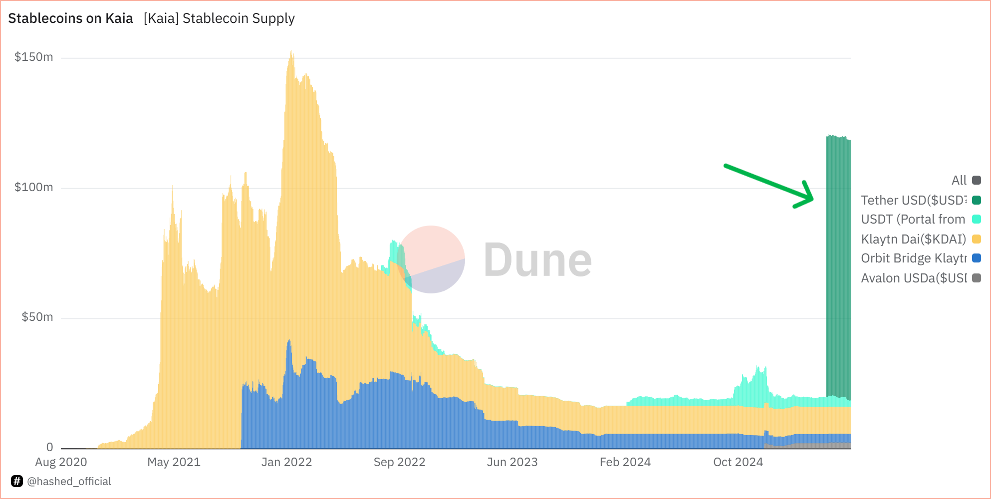Tout d'abord, le géant du stablecoin Tether a déployé 100 millions de dollars d'USDT nativement sur la blockchain Kaia :