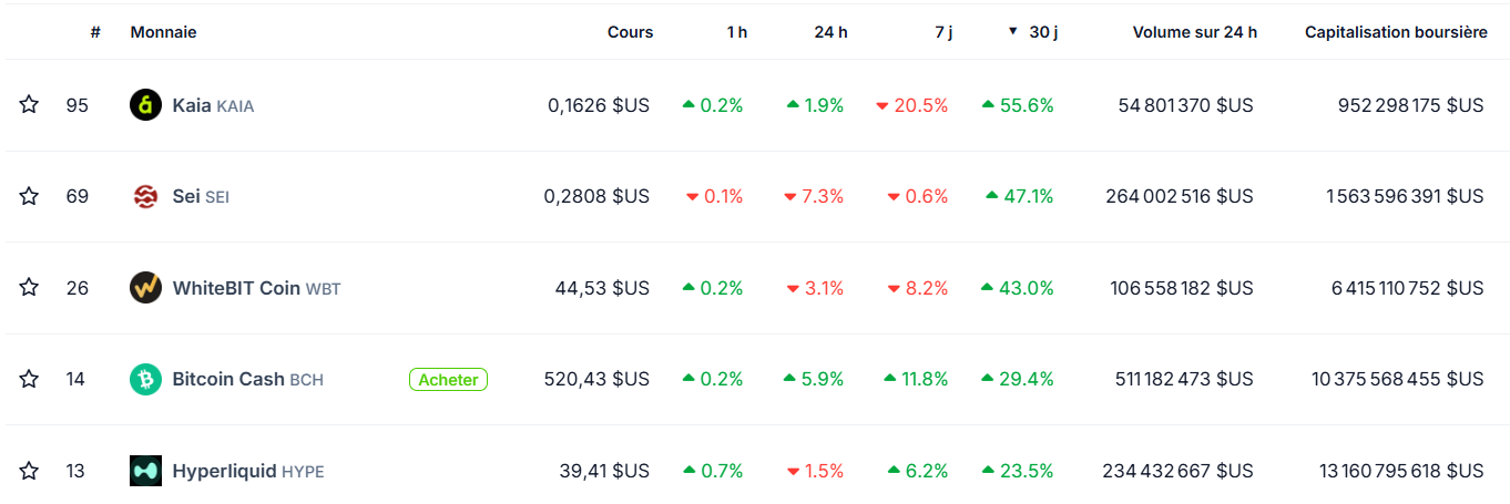 Parmi celles-ci, les cryptos HYPE, BCH, WBT, SEI et KAIA arrivent en tête de notre Top mensuel :