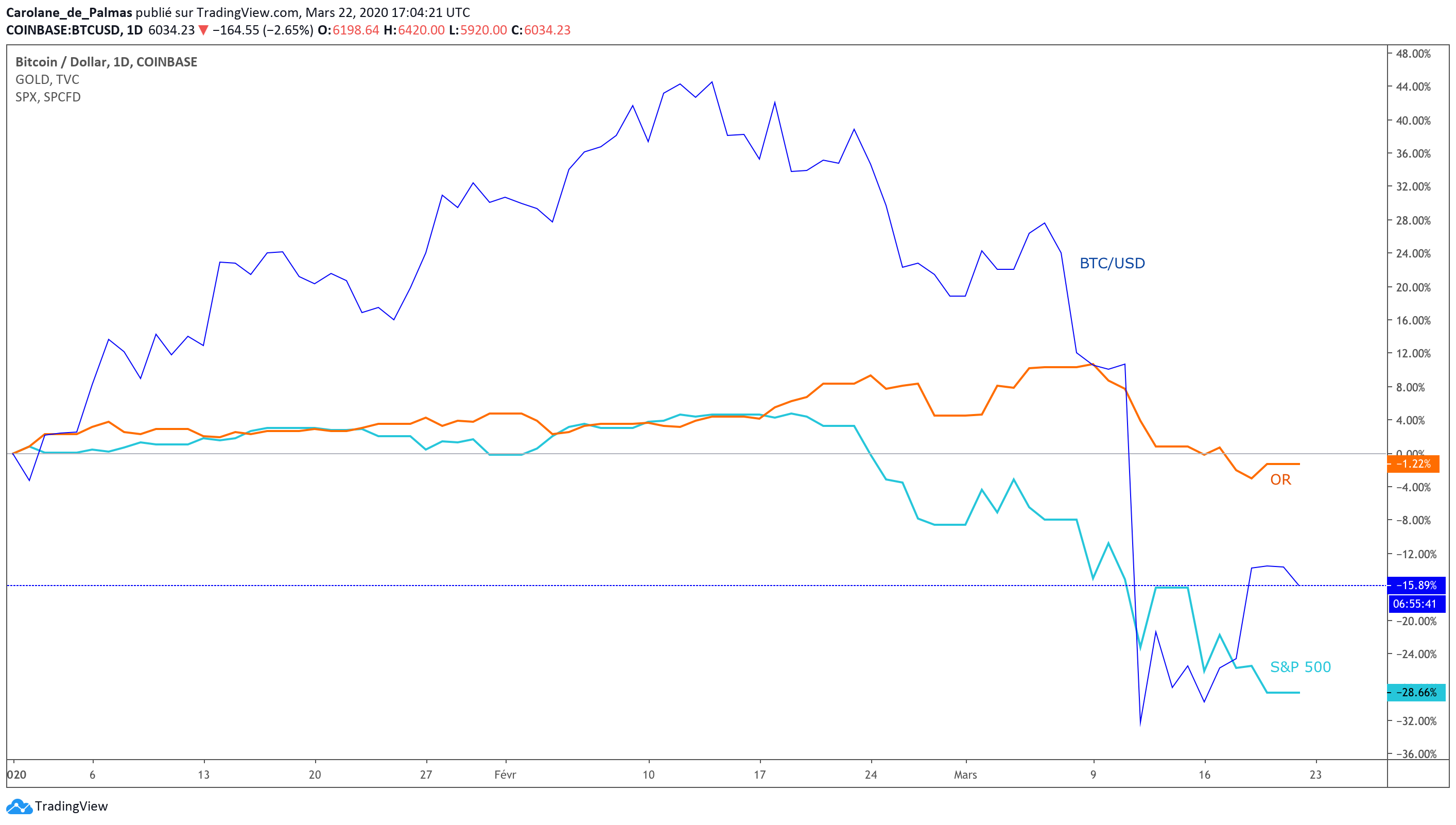 Entre le plus bas atteint le 13 mars dernier et actuellement, le cours de la paire BTC/USD s’est repris de plus de 55 % d'après les données de Coinbase. De son côté, le S&P 500 a continué sa chute et évolue au plus bas depuis février 2017.