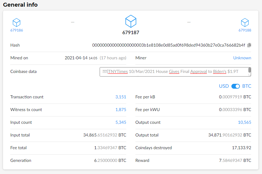 Les données du bloc 679187, miné ce 14 avril 2021 à 15h30 peu après le listing, sont accessibles via le site Blockchair.